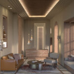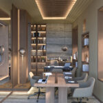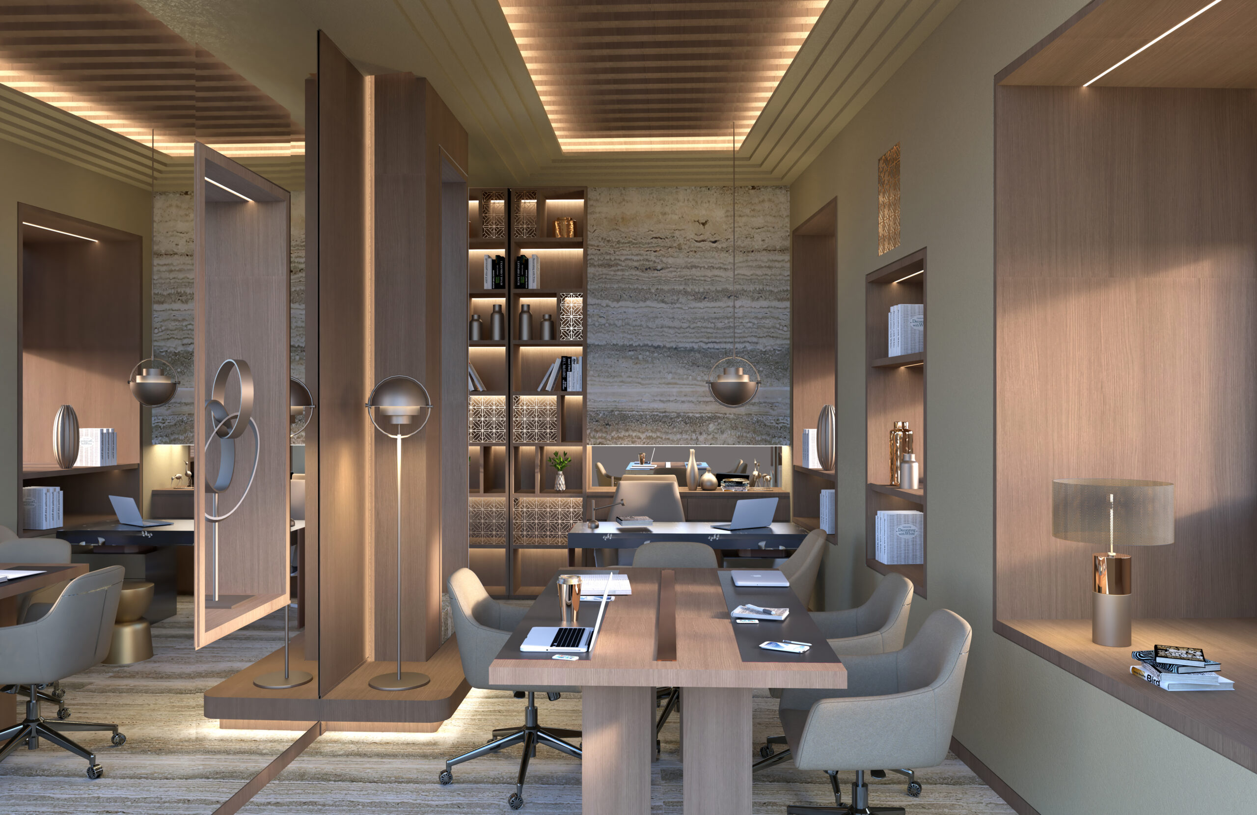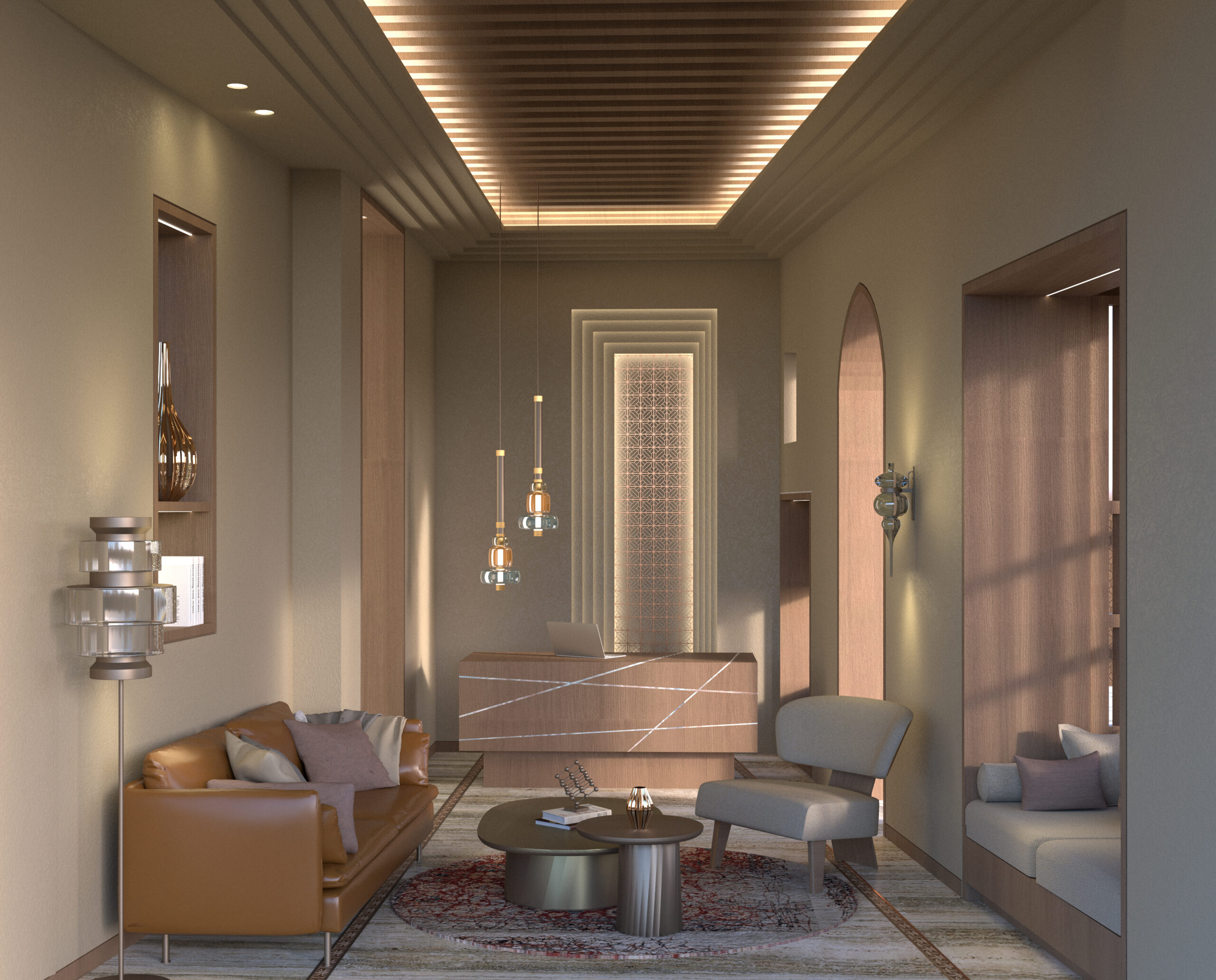 Set within the preserved shell of a traditional Saudi building, this interior reimagines heritage through a contemporary lens. Arched thresholds, warm stone textures, and geometric lattice motifs subtly nod to Hijazi architecture, while custom lighting and sleek millwork introduce modern functionality. The palette of date-hued woods, soft neutrals, and metallic accents adds depth without overpowering the building’s original character. Designed for privacy, prestige, and performance, this office space bridges old soul and new purpose in the heart of Jeddah.